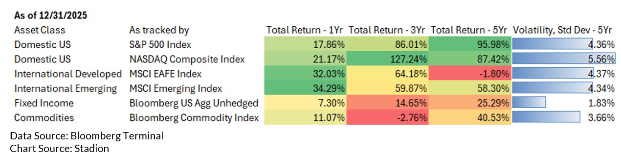 2025 shined on diversified investors, with positive absolute returns across many major asset classes- domestic equities, international equities, fixed income, and commodities. Market performance was shaped by a combination of moderated economic growth, a transition in monetary policy, and persistent concentration within equity leadership. The chart below shows the returns and the five-year volatility (using standard deviation) for the asset classes listed.